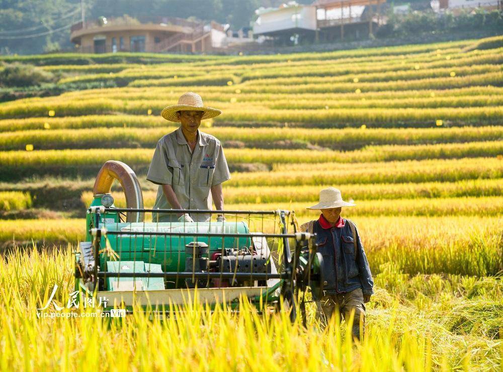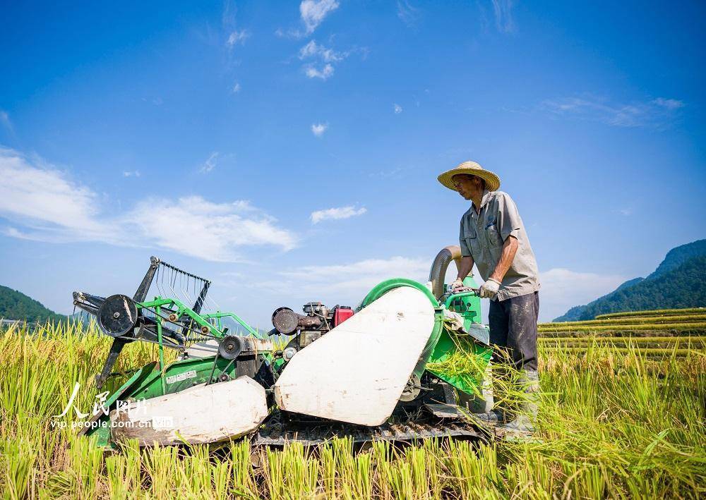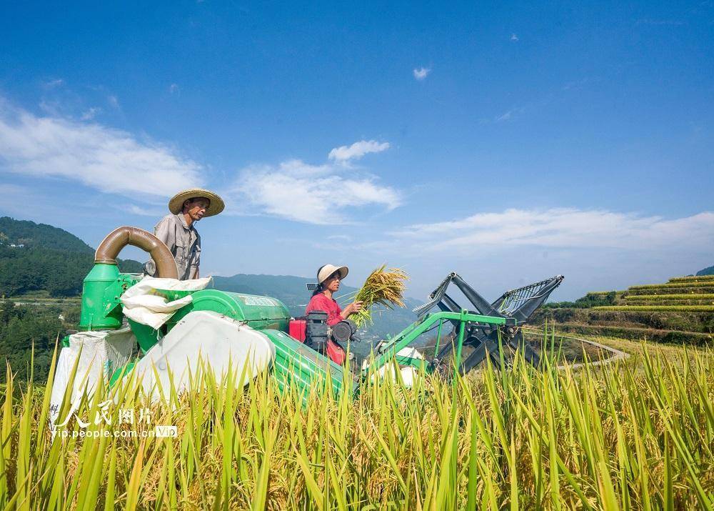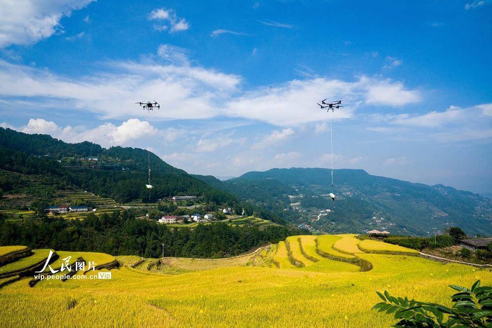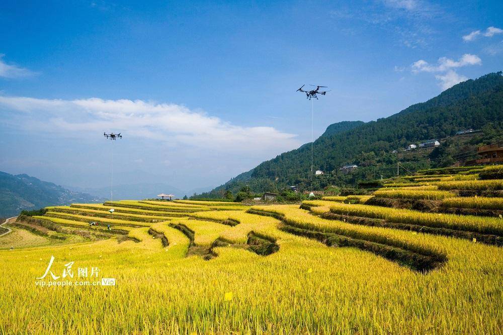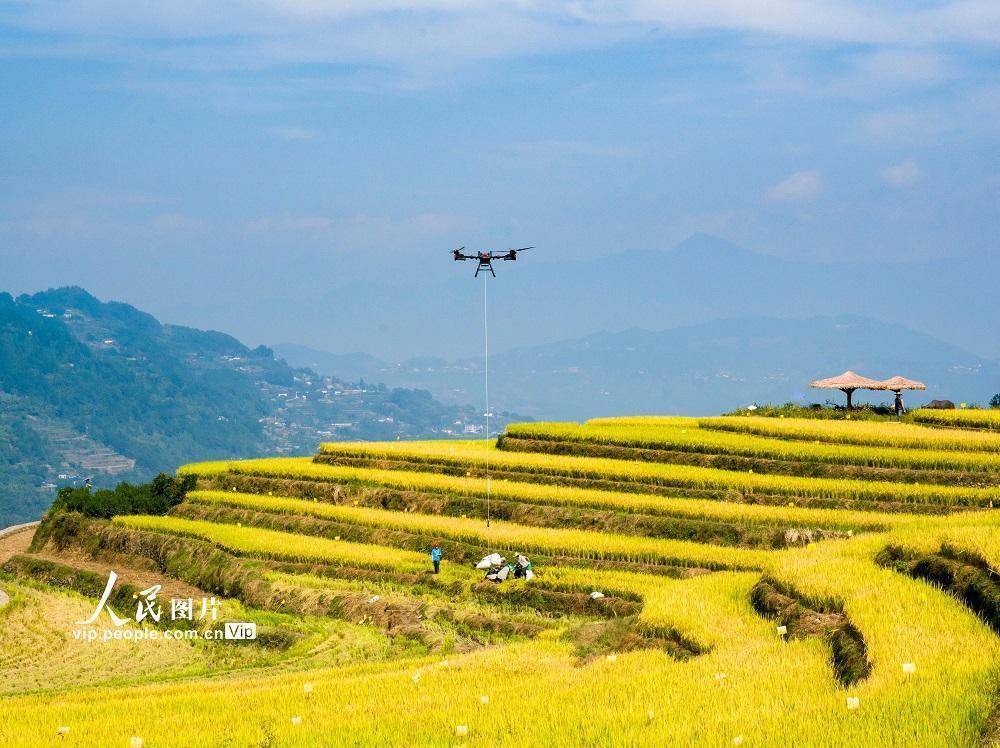 近年来,当地以“公司+合作社+农户”的模式,发展采用传统方式种植的冷水稻产业,以山泉水灌溉的高品质特色冷水稻深受市场欢迎。同时,当地积极推广机械收割与无人机吊运,提升作业效率,降低农业生产成本。周仕伟摄(人民图片网)